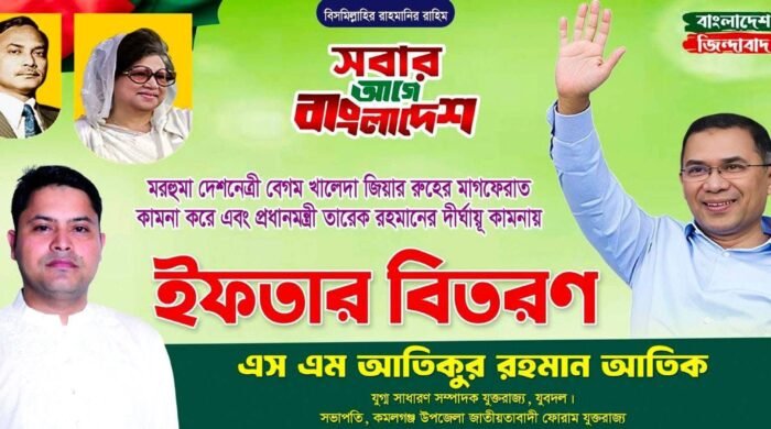 সাবেক তিনবারের প্রধানমন্ত্রী মরহুমা বেগম খালেদা জিয়ার রুহের মাগফেরাত কামনা এবং বিএনপির ভারপ্রাপ্ত চেয়ারম্যান তারেক রহমানের সুস্বাস্থ্য ও দীর্ঘায়ু কামনায় মৌলভীবাজারের কমলগঞ্জ উপজেলার ভানুগাছ বাজারের বিভিন্ন পয়েন্টে পথচারীদের মাঝে ইফতার
